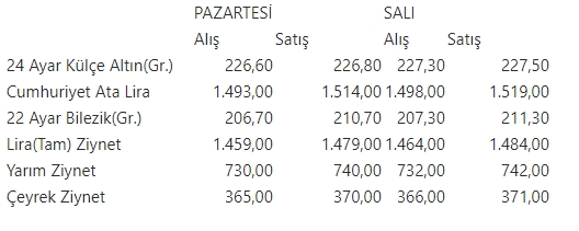 İstanbul Kapalıçarşı'da 24 ayar külçe altının gram satış fiyatı 227,50 lira, Cumhuriyet altınının satış fiyatı 1.519,00 lira oldu.