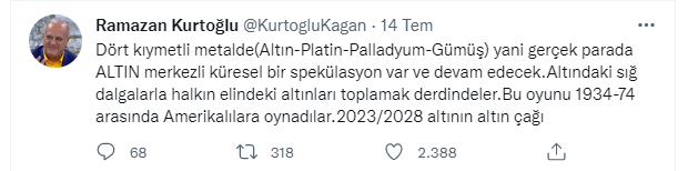 Ramazan Kurtoğlu sosyal medya hesabından yaptığı açıklamada, altın için beklemede kalanların zengin olacağını belirterek "Dört kıymetli metalde(Altın-Platin-Palladyum-Gümüş) yani gerçek parada ALTIN merkezli küresel bir spekülasyon var ve devam edecek. Altındaki sığ dalgalarla halkın elindeki altınları toplamak derdindeler. Bu oyunu 1934-74 arasında Amerikalılara oynadılar. 2023/2028 altının altın çağı" dedi.