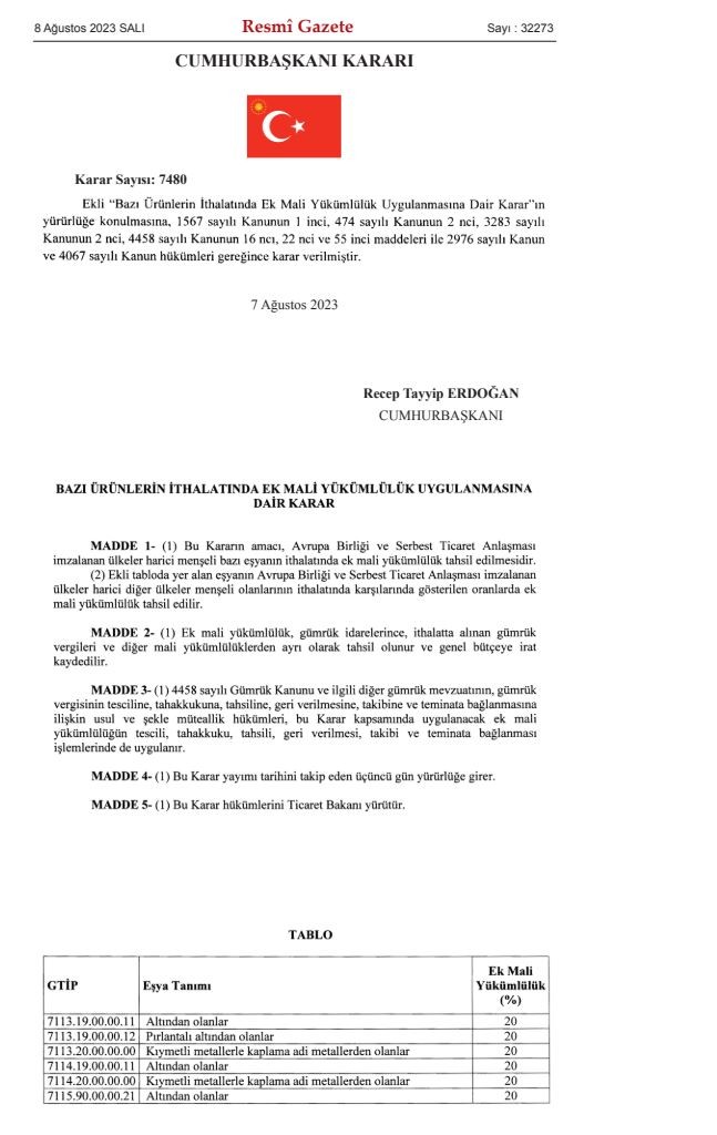 Bazı kuyumculuk ürünlerinin ve mücevherlerin AB dışındaki ülkelere ithalatına yüzde 20 ek mali yükümlülük getirildi. Cumhurbaşkanı Erdoğan'ın imzasıyla Resmi Gazete'de yayınlanan karar, 3 gün sonra yürürlüğe girecek.