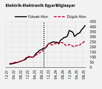 Analize göre, altın birikimi yüksek olan iller ile düşük olan iller arasında, yatırımcının yaptığı harcamada en belirgin fark elektrik-elektronik eşya/bilgisayar kategorisinde gözlemlendi. Veriler, yatırımcının elde ettiği kârı elektronik eşya alarak değerlendirdiğini gösteriyor.