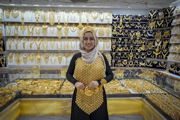 Dubai'de yaşayan Türk vatandaşı Merve Erkol da çarşıda sergilenen birçok altın kıyafetten biri olan bluz şeklinde kolye ile kemer, bilezik, yüzük ve taçtan oluşan seti üzerine giydi.