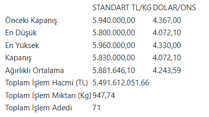 Tüm metallerde toplam işlem hacmi ise 5 milyar 958 milyon 287 bin 922,84 lira olarak gerçekleşti.