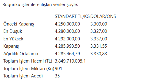KMKTP'de altında toplam işlem hacmi 3 milyar 849 milyon 710 bin 5,1 lira, işlem miktarı ise 901 kilogram oldu.