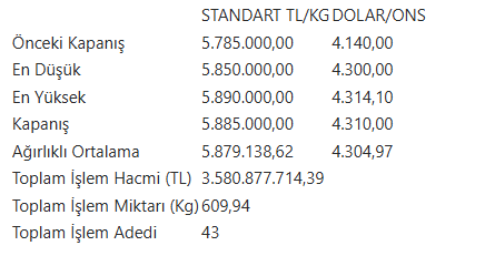 KMKTP'de altında toplam işlem hacmi 3 milyar 580 milyon 877 bin 714,39 lira, işlem miktarı ise 609,94 kilogram oldu.