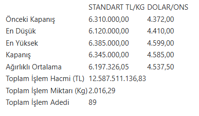KMKTP'de altında toplam işlem hacmi 12 milyar 587 milyon 511 bin 136,83 lira, işlem miktarı ise 2 bin 16,29 kilogram oldu.
