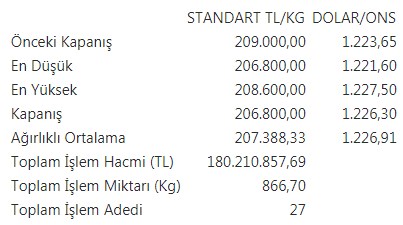 KMKTP'de, altında gerçekleşen toplam işlem hacmi 180 milyon 210 bin 857,69 lira, işlem miktarı ise 866 kilogram oldu. Tüm metallerdeki toplam işlem hacmi ise 182 milyon 336 bin 580,38 lira oldu.