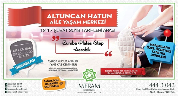 Meram Belediyesi tarafından Alavardı Mahallesinde geçtiğimiz yıl hizmete açılan Altuncan Hatun Aile Yaşam Merkezinin spor salonunda hanımlara özel ücretsiz zumba, plates, step-aerobik seansları düzenleniyor. 09.30, 15.00 ve 18.00’de gerçekleştirilen seanslarda ayrıca vücut yağ analizi, bireysel antrenman programı ve masa tenisi imkanı da sunuluyor.