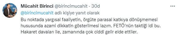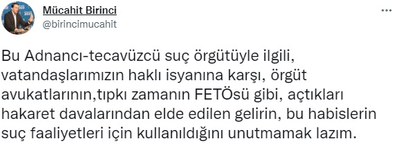 Birinci yaptığı paylaşımda, “Bu Adnancı-tecavüzcü suç örgütüyle ilgili, vatandaşlarımızın haklı isyanına karşı, örgüt avukatlarının,tıpkı zamanın FETÖ’sü gibi, açtıkları hakaret davalarından elde edilen gelirin, bu habislerin suç faaliyetleri için kullanıldığını unutmamak lazım. Bu noktada yargısal faaliyetin, örgüte parasal katkıya dönüşmemesi hususunda azami dikkatin gösterilmesi lazım. FETÖ'nün taktiği idi bu. Hakaret davaları ile, zamanında çok ciddi gelir elde ettiler” dedi.