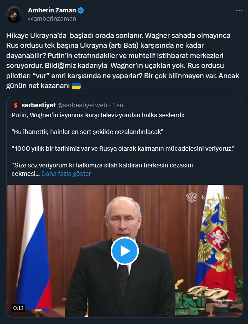 Hikaye Ukrayna’da başladı orada sonlanır. Wagner sahada olmayınca Rus ordusu tek başına Ukrayna (artı Batı) karşısında ne kadar dayanabilir? Putin’in etrafındakiler ve muhtelif istihbarat merkezleri soruyordur. Bildiğimiz kadarıyla Wagner’ın uçakları yok. Rus ordusu pilotları “vur” emri karşısında ne yaparlar? Bir çok bilinmeyen var. Ancak günün net kazananı Ukrayna.