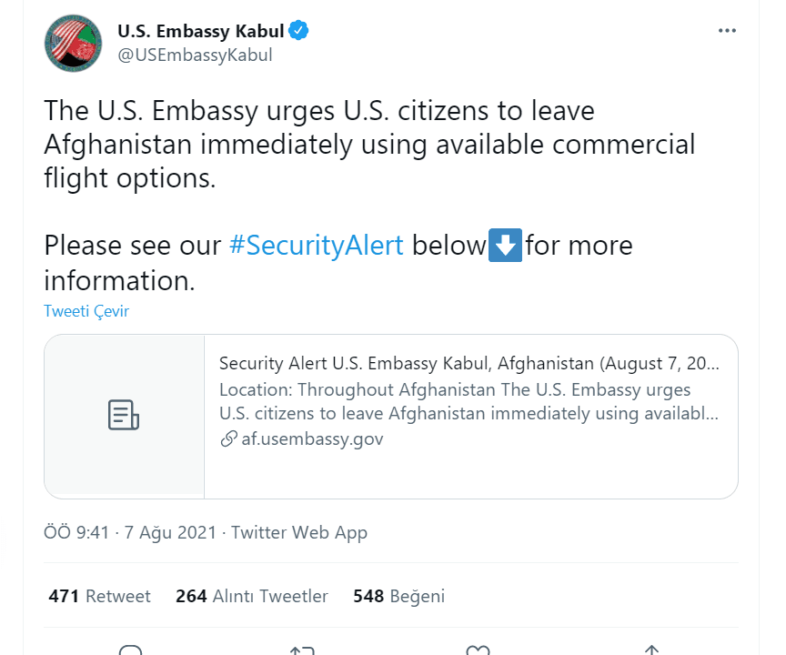 Büyükelçilikten yapılan açıklamada, ABD vatandaşlarının var olan ticari uçuşları kullanarak Afganistan'ı bir an önce terk etmesi istendi.