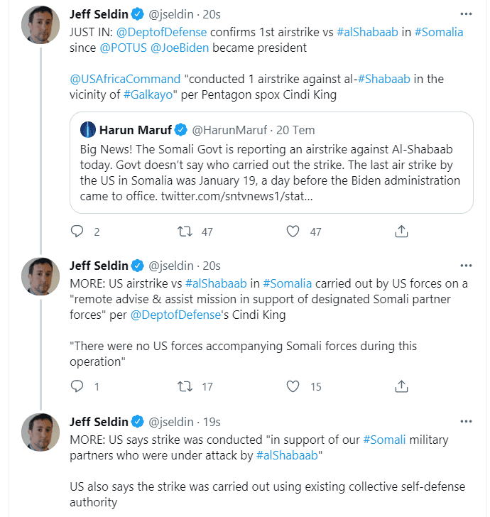 ABD’nin Somali’ye yönelik en son hava saldırısı, Biden’ın yemin töreninden bir gün önce 19 Ocak’ta gerçekleştirilmişti.