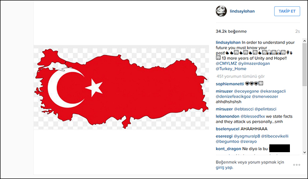 Twitter'dan da aynı paylaşımı yapan Lindsay Lohan'ın bu sözlerinin altına ise özellikle Türkiye'den hakaret dolu yorum yapanlar dikkat çekti. Bir kısım Türk kullanıcılar Lohan'a hakaretler ve küfürler yağdırırken, bir taraftan da Erdoğan'ın diktatör olduğunu yazdılar.