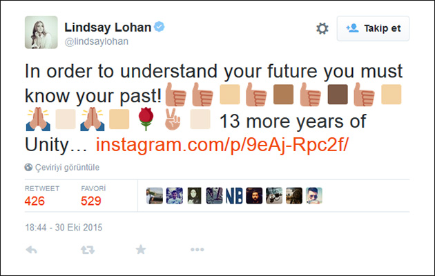 Cem Yılmaz'ı da etiketleyerek "geleceğini anlamak için geçmişini bilmen gerekir. Birlik ve umut dolu nice 13 yıllara..." paylaşımında bulunan Lohan, fotoğraf kısmına ise Türk Bayrağı koydu.