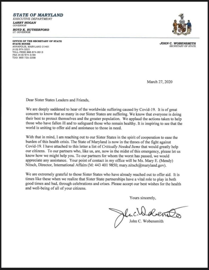 Maryland eyaletinin Cumhuriyetçi Valisi, ekinde “kritik gerekli eksiklikler” listesinin yer aldığı bir mektupla Türkiye'den yardım talebinde bulundu.
