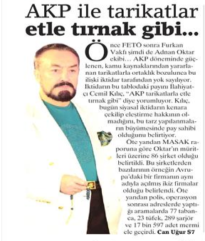 Sözde gazetenin birinci sayfasında yer alan bir haberde, “AKP ile tarikatlar etle tırnak gibi…” başlığı atıldı. Haberin detayında ise, Oktar ve diğer cemaatlerle AK Parti’nin “ortaklığı bozulduktan sonra” operasyonların yapıldığı savunuldu. Oysa hem FETÖ ile hem de Adnan Oktar Suç Örgütü ile Türkiye tarihinde en gerçekçi mücadele Erdoğanlı yıllarda yapıldı. 28 Şubat sürecinde sahtekâr dini yapılanmalara yol açılırken, Erdoğan döneminde ise terör ve suç yapılanmalarıyla sahtekâr yapılanmalara en büyük darbeler vuruldu.
