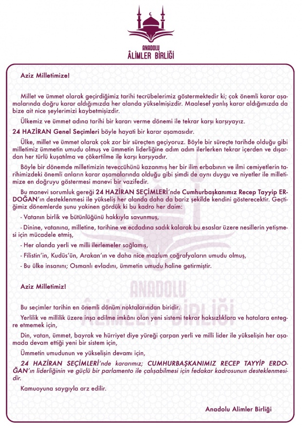 Ülkemiz ve ümmet adına yine tarihi bir karar aşamasında olduğumuzun vurgulandığı açıklamada, 24 Haziran seçimlerinin hayati bir karar aşaması olduğu ifade edilerek, "24 Haziran seçimlerinde kararımız, Cumhurbaşkanımız Recep Tayyip Erdoğan'ın liderliğinin ve güçlü bir parlamento ile çalışabilmesi için fedakar kadrosunun desteklenmesidir" denildi.