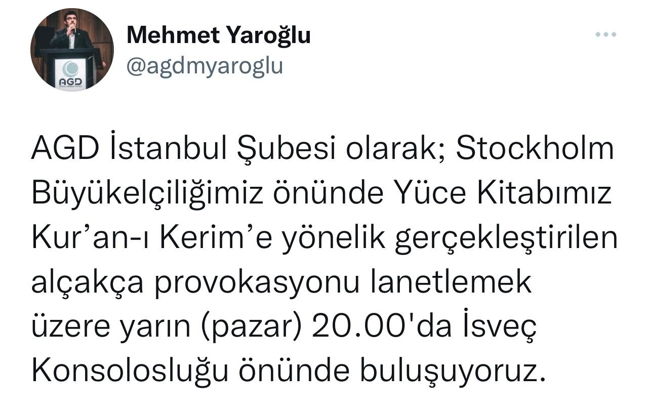 "AGD İstanbul Şubesi olarak; Stockholm Büyükelçiliğimiz önünde Yüce Kitabımız Kur’an-ı Kerim’e yönelik gerçekleştirilen alçakça provokasyonu lanetlemek üzere yarın (pazar) 20.00'da İsveç Konsolosluğu önünde buluşuyoruz."