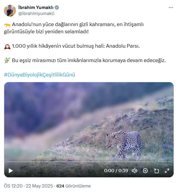 Bakan İbrahim Yumaklı, Dünya Doğa ve Doğal Kaynakları Koruma Birliği'ne göre nesli 'en tehlikede' kategorisinde yer alan koruma altındaki Anadolu parsının, fotokapana yansıyan yeni görüntüsünü sosyal medya hesabından paylaştı. Bakan Yumaklı, "Anadolu'nun yüce dağlarının gizli kahramanı, en ihtişamlı görüntüsüyle bizi yeniden selamladı. 1000 yıllık hikayenin vücut bulmuş hali; Anadolu parsı. Bu eşsiz mirasımızı tüm imkanlarımızla korumaya devam edeceğiz" ifadelerini kullandı.