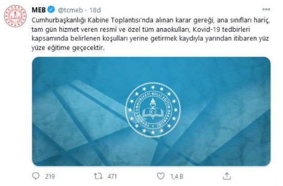 Milli Eğitim Bakanlığı (MEB), 15 Aralık Salı'dan ana sınıfları hariç, tam gün hizmet veren resmî ve özel tüm anaokullarında yüz yüze eğitimin başlayacağını açıkladı. Cumhurbaşkanlığı Kabine Toplantısında tüm anaokullarının 15 Aralık itibarıyla yüz yüze eğitime geçmesi kararlaştırıldı.