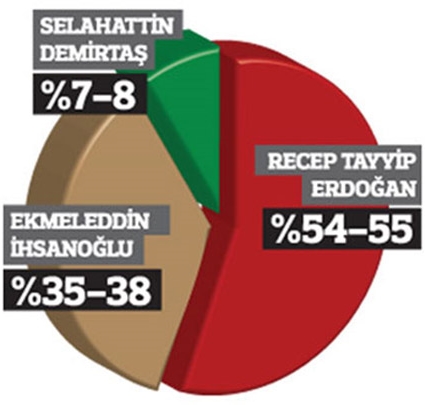 Son iki yerel seçim anketinde tam isabet yapan ANAR'a göre Erdoğan yüzde 55, İhsanoğlu yüzde 38, Demirtaş yüzde 8 oy alacak.