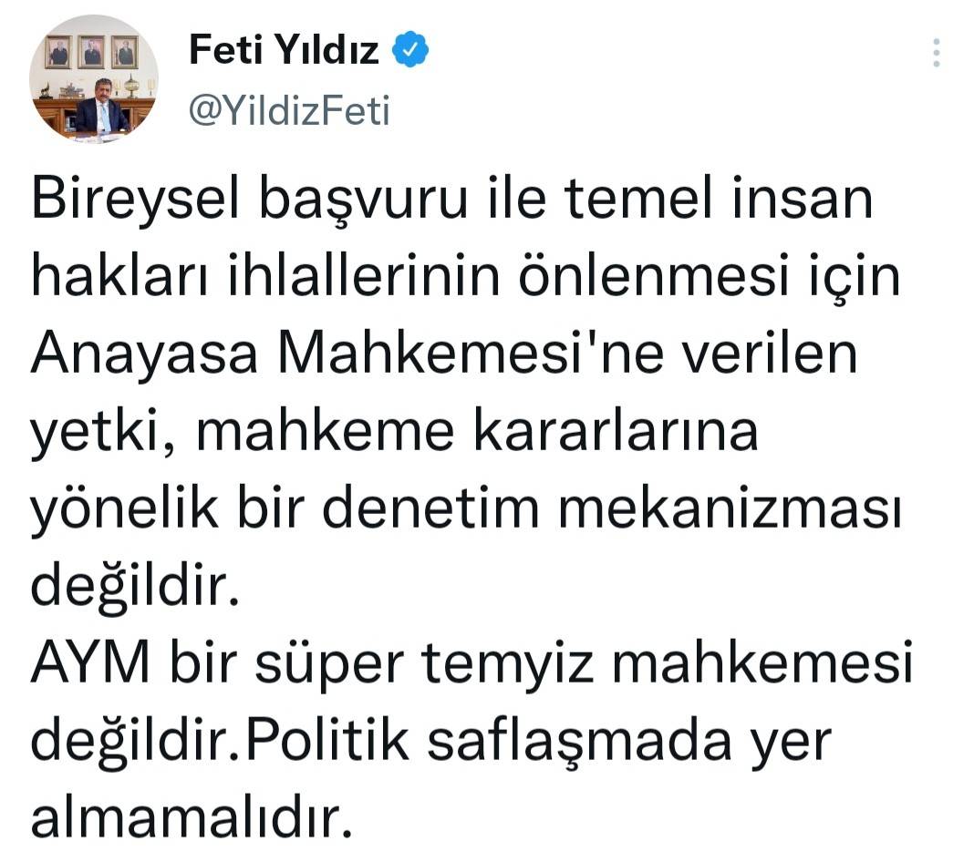MHP Hukuk ve Seçim İşlerinden Sorumlu Genel Başkan Yardımcısı ve İstanbul Milletvekili Feti Yıldız sosyal medya hesabından "AYM politik saflaşmada yer almamalıdır" paylaşımında bulundu.