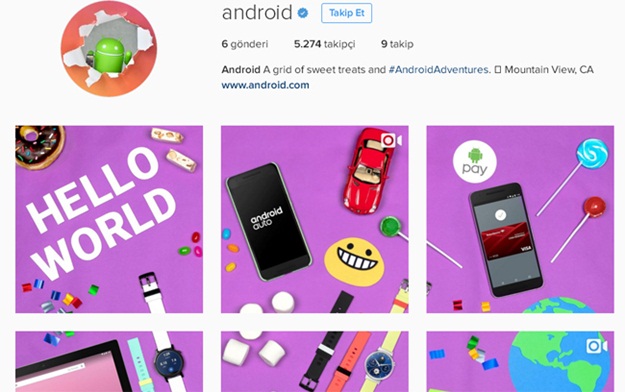 Google, Android için Instagram üzerinde Merhaba Dünya kolajı ile @android adında resmi bir hesap açtı.