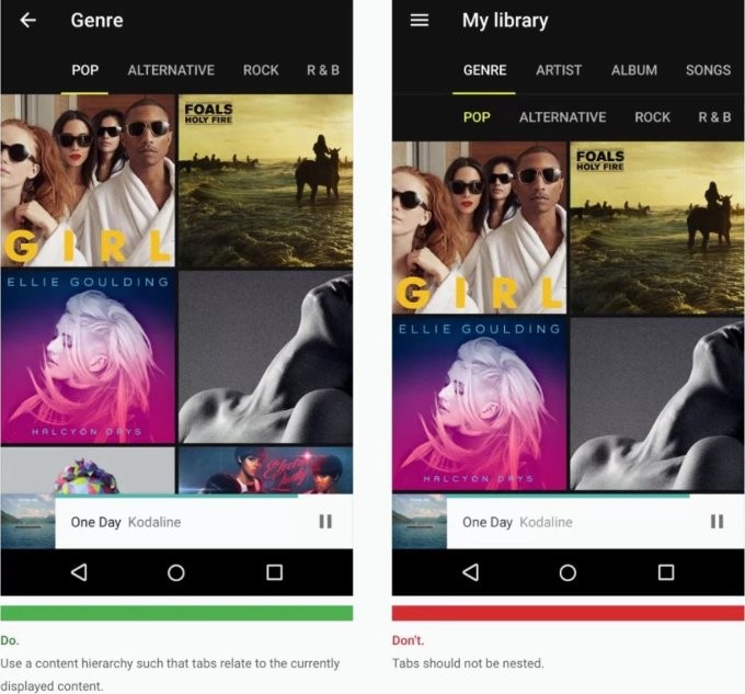 Zira Google, materyal tasarım anlayışında iç içe geçmiş sekmelerin kullanılmaması gerektiğini uygulama geliştiricilere açıkla belirtiyor.