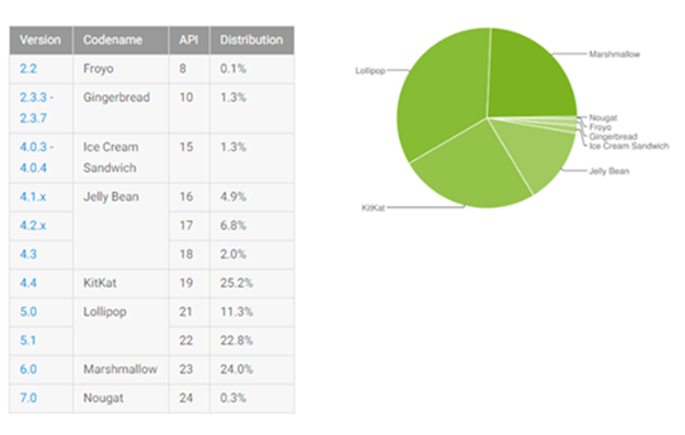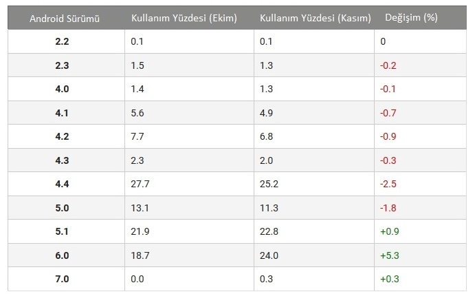 Tablodan da görebileceğiniz gibi Android 5.1’in kullanım oranındaki artış, Android 7.0’ın kullanım oranındaki artıştan çok daha fazla. Bu da orta seviye telefon satışlarının artığını gösteriyor.