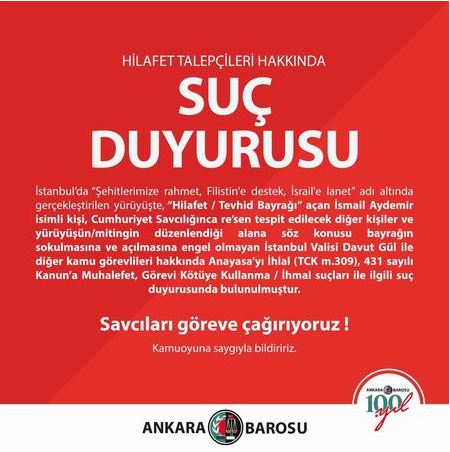 Ankara 1 Nolu Barosu, Pazartesi günü Galata Köprüsü'nde gerçekleşen Filistin'e destek yürüyüşünden dönerken elinde Tevhid bayrağı bulunması nedeniyle ırkçı bir tip tarafından saldırıya uğrayan İsmail Aydemir'e ve Tevhid bayrağının alana sokulmasına müsaade edilen görevliler hakkında suç duyurunda bulunduğunu duyurdu.