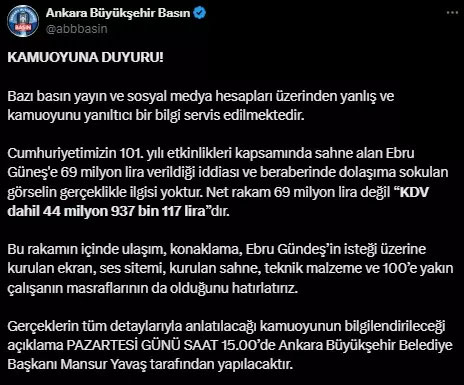 Belediyeden yapılan açıklamada şu ifadelere yer verildi: "Bazı basın yayın ve sosyal medya hesapları üzerinden yanlış ve kamuoyunu yanıltıcı bir bilgi servis edilmektedir. Cumhuriyetimizin 101. yılı etkinlikleri kapsamında sahne alan Ebru Güneş'e 69 milyon lira verildiği iddiası ve beraberinde dolaşıma sokulan görselin gerçeklikle ilgisi yoktur. Net rakam 69 milyon lira değil "KDV dahil 44 milyon 937 bin 117 lira"dır. Bu rakamın içinde ulaşım, konaklama, Ebru Gündeş'in isteği üzerine kurulan ekran, ses sitemi, kurulan sahne, teknik malzeme ve 100'e yakın çalışanın masraflarının da olduğunu hatırlatırız.