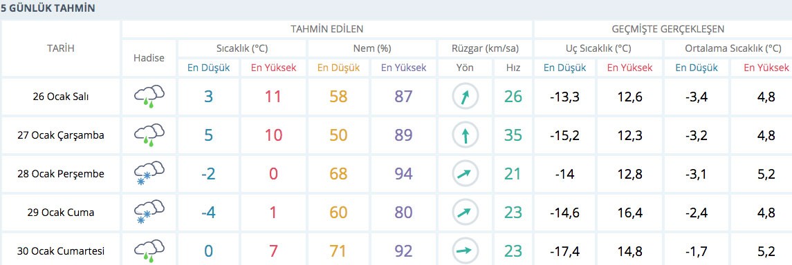 Ankara’da hava bugün, 10°C. Parçalı, yer yer çok bulutlu, öğle saatlerinden sonra yağmurlu. Ankara’da Salı günü en düşük sıcaklık 3 derece olurken en yüksek sıcaklık 11 derece, Çarşamba gün en düşük sıcaklık 5 derece, en yüksek sıcalık 10 derece. Ankara’da Çarşamba günü hava sıcaklığı en düşük -2, en yüksek 0 derece olduğu görünüyor.