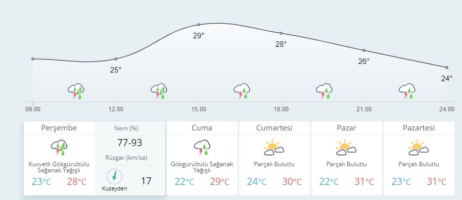 Parçalı ve çok bulutlu, aralıklı ve yerel olmak üzere sağanak ve gök gürültülü sağanak yağışlı geçeceği tahmin ediliyor. Yağışların öğle saatlerinden sonra yer yer kuvvetli olması bekleniyor.
