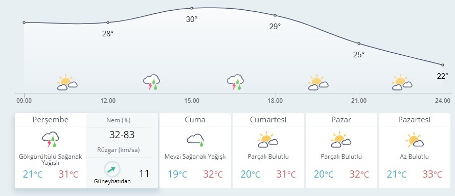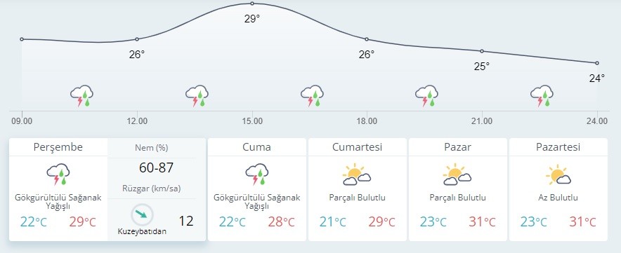 Meteoroloji Genel Müdürlüğü tarafından yapılan son değerlendirmelere göre: Ülkemizin kuzey, iç ve batı kesimlerinin parçalı ve yer yer çok bulutlu, Marmara, Ege, Batı Akdeniz, İç Anadolu’nun kuzeybatısı, Batı Karadeniz, Çorum çevreleri, Hatay’ın kıyı, Ordu, Giresun, Trabzon ve Rize’nin iç kesimleri ile Doğu Akdeniz'in Toroslar kesiminin yerel olmak üzere sağanak ve gök gürültülü sağanak yağışlı, diğer yerlerin az bulutlu ve açık geçeceği tahmin ediliyor. Yağışların; Marmara Bölgesi, Manisa, Kütahya, Eskişehir, Bolu ve Düzce çevreleri ile Ankara’nın kuzeybatı kesimlerinde yerel olarak kuvvetli olması bekleniyor.