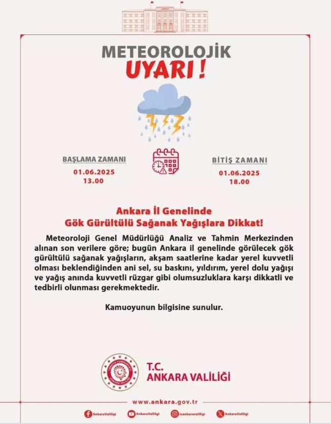 Valiliğin sosyal medya hesabından yaptığı paylaşımda, "Meteoroloji Genel Müdürlüğü Analiz ve Tahmin Merkezinden alınan son verilere göre, bugün Ankara il genelinde görülecek gök gürültülü kuvvetli sağanak yağışların, akşam saatlerine kadar yerel kuvvetli olması beklendiğinden ani sel, su baskını, yıldırım, yerel dolu yağışı, ve yağış anında kuvvetli rüzgar gibi olumsuzluklara karşı dikkatli ve tedbirli olunması gerekmektedir" ifadelerine yer verildi.