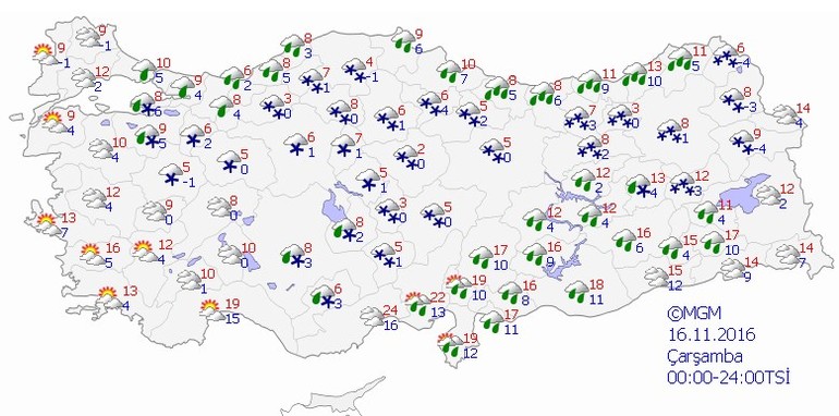 Yapılan son değerlendirmelere göre; bugün yurdun geneli parçalı ve çok bulutlu, kuzey, iç ve doğu kesimleri yağışlı geçeceği tahmin ediliyor. Yağışların; genellikle yağmur, Karadeniz'in iç kesimleri, İç Anadolu, Doğu Anadolu ile Kütahya çevrelerinde karla karışık yağmur ve kar şeklinde olması, Orta ve Doğu Karadeniz kıyılarında kuvvetli yağmur, öğle saatlerinden itibaren Orta ve Doğu Karadeniz'in iç kesimleri ile Doğu Anadolu'nun orta kesimlerinde yoğun kar yağışı bekleniyor. Gece saatlerinde İç Ege, İç Anadolu'nun doğusunda yer yer sis ve pus hadisesi bekleniyor.