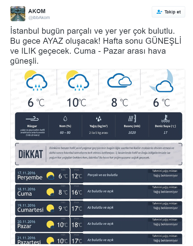 İstanbul Büyükşehir Belediyesi Afet Koordinasyon Merkezi (AKOM) de Twitter hesabından yaptığı açıklamada, "İstanbul bugün parçalı ve yer yer çok bulutlu. Bu gece ayaz oluşacak! Hafta sonu güneşli ve ılık geçecek. Cuma - Pazar arası hava güneşli.