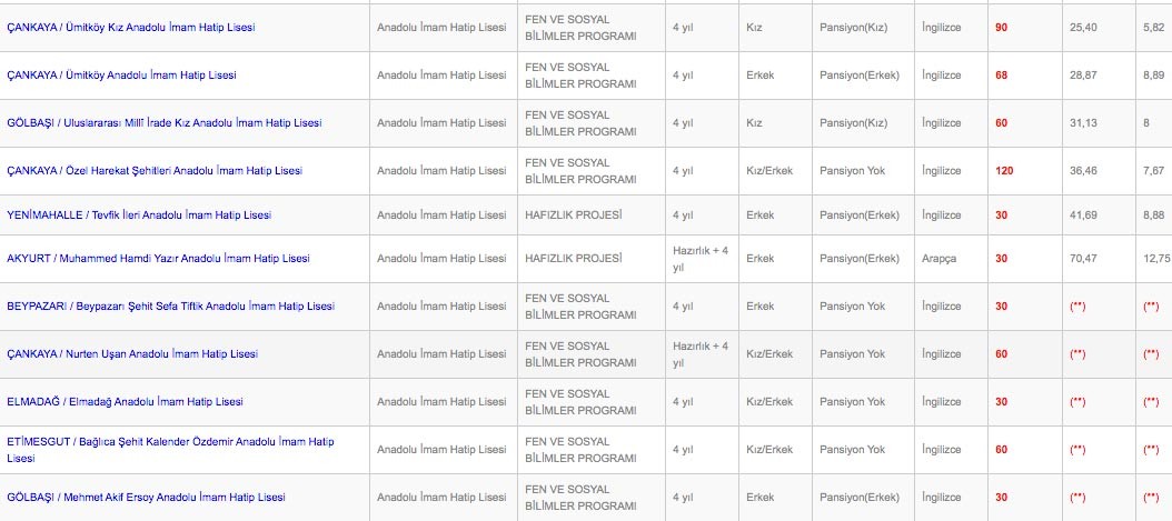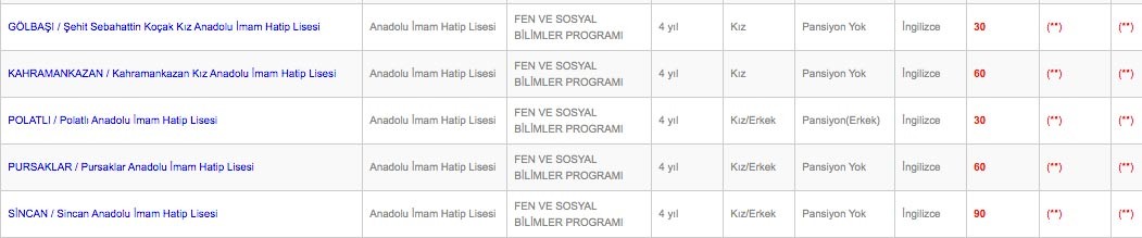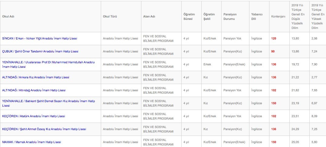 Ankara İmam Hatip Lisesi en düşük yüzdelik dilim en yüksek yüzdelik dilim 2020
