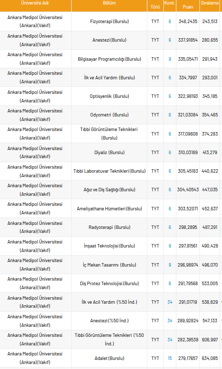 Ankara Medipol Üniversitesi 2 yıllık taban puanları 2021, yüzdelik dilimleri ve kontenjan sayıları kaçtır?