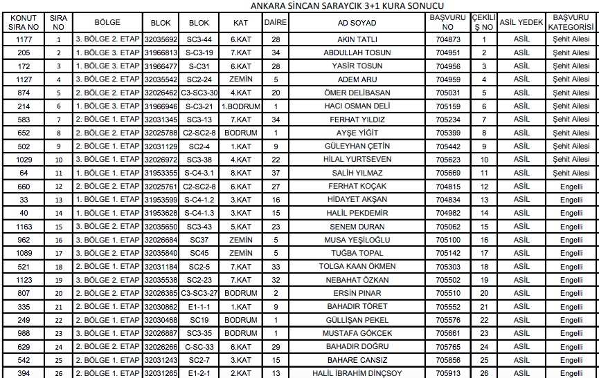 TOKİ Ankara Sincan kura sonuçları için tıklayınız