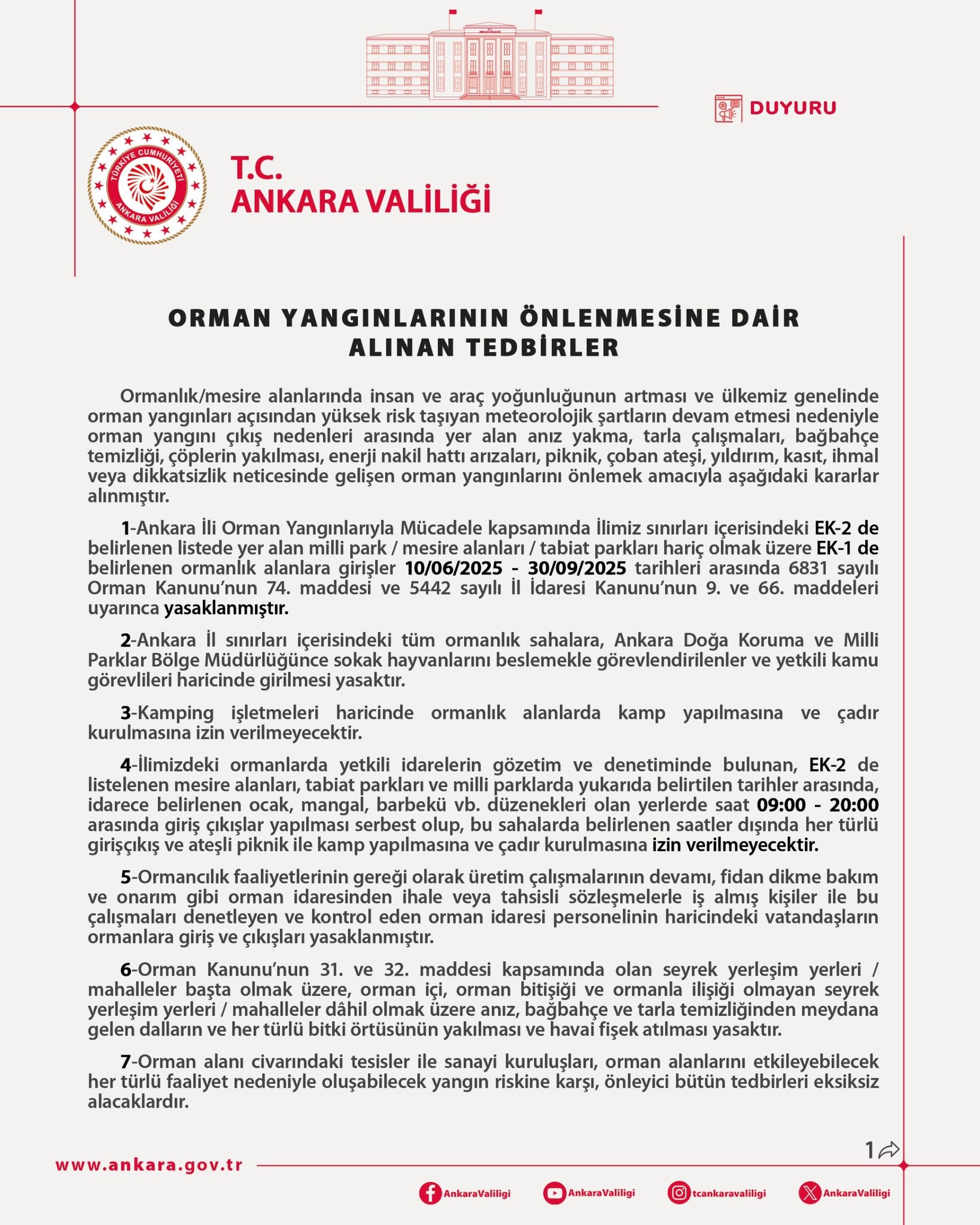 "Ankara il sınırları içerisindeki tüm ormanlık sahalara, Ankara Doğa Koruma ve Milli Parklar Bölge Müdürlüğünce sokak hayvanlarını beslemekle görevlendirilenler ve yetkili kamu görevlileri haricinde girilmesi yasaktır. Kamping işletmeleri haricinde ormanlık alanlarda kamp yapılmasına ve çadır kurulmasına izin verilmeyecektir. İlimizdeki ormanlarda yetkili idarelerin gözetim ve denetiminde bulunan mesire alanları, tabiat parkları ve milli parklarda; yukarıda belirtilen tarihler arasında, idarece belirlenen ocak, mangal, barbekü vb. düzenekleri olan yerlerde saat 09.00-20.00 arasında giriş çıkışlar yapılması serbest olup, bu sahalarda belirlenen saatler dışında her türlü giriş çıkış ve ateşli piknik ile kamp yapılmasına ve çadır kurulmasına izin verilmeyecektir. Ormancılık faaliyetlerinin gereği olarak üretim çalışmalarının devamı, fidan dikme bakım ve onarım gibi orman idaresinden ihale veya tahsisli sözleşmelerle iş almış kişiler ile bu çalışmaları denetleyen ve kontrol eden orman idaresi personelinin haricindeki vatandaşların ormanlara giriş ve çıkışları yasaklanmıştır. Orman Kanunu'nun 31 ve 32'nci maddesi kapsamında olan seyrek yerleşim yerleri / mahalleler başta olmak üzere, orman içi, orman bitişiği ve ormanla ilişiği olmayan seyrek yerleşim yerleri / mahalleler dahil olmak üzere anız, bağ bahçe ve tarla temizliğinden meydana gelen dalların ve her türlü bitki örtüsünün yakılması ve havai fişek atılması yasaktır."