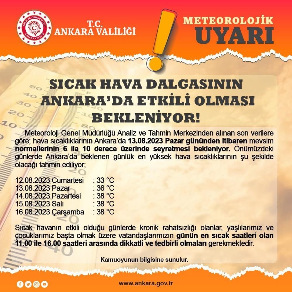 Ankara Valiliği sıcak havaların beklenmesi nedeniyle meteorolojik uyarı yayımladı.