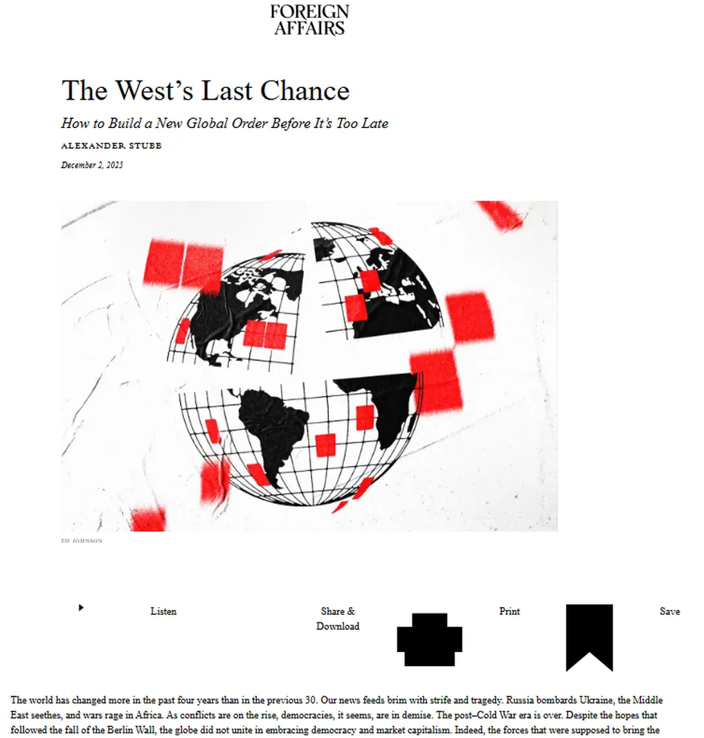 Finlandiya Cumhurbaşkanı Alexander Stubb, Foreign Affairs dergisindeki "Batı'nın son şansı" başlıklı makalesiyle ABD ve Avrupa başkentlerinde adeta alarm zilleri çaldırdı. Stubb, II. Dünya Savaşı sonrasında inşa edilen liberal ve kurallara dayalı düzenin çöktüğünü, dünyanın "yeni bir düzensizlik çağında" savrulduğunu yazdı.