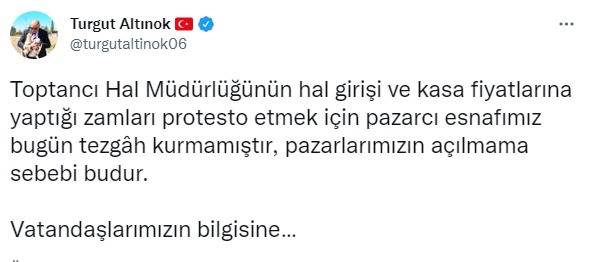 Sosyal medya hesabından paylaşım yapan Keçiören Belediye Başkanı Turgut Altınok şu ifadelere yer verdi, “Toptancı Hal Müdürlüğünün hal girişi ve kasa fiyatlarına yaptığı zamları protesto etmek için pazarcı esnafımız bugün tezgâh kurmamıştır, pazarlarımızın açılmama sebebi budur. Vatandaşlarımızın bilgisine…”