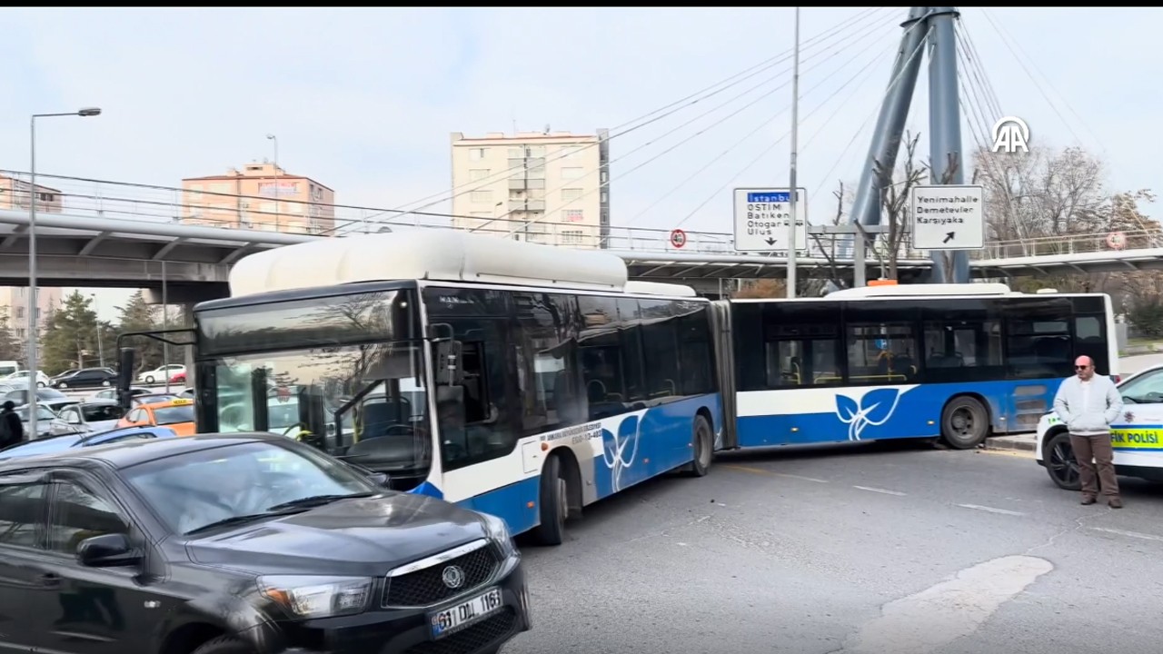 Ankara'nın Yenimahalle ilçesinde refüj üzerinden dönüş yapmaya çalışırken askıda kalan belediye otobüsü nedeniyle ulaşımda aksama yaşandı.