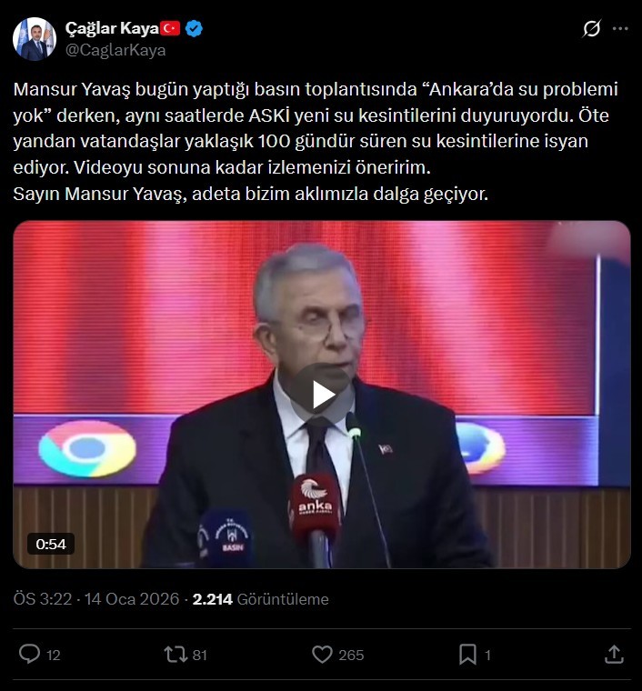 AK Parti Ankara İl Başkan Yardımcısı Çağlar Kaya, vatandaşların tepkisine ilişkin görüntüleri aktardığı sosyal medya hesabından yaptığı açıklamada; “Mansur Yavaş bugün yaptığı basın toplantısında ‘Ankara’da su problemi yok’ derken, aynı saatlerde ASKİ yeni su kesintilerini duyuruyordu. Öte yandan vatandaşlar yaklaşık 100 gündür süren su kesintilerine isyan ediyor. Videoyu sonuna kadar izlemenizi öneririm. Sayın Mansur Yavaş, adeta bizim aklımızla dalga geçiyor” dedi.