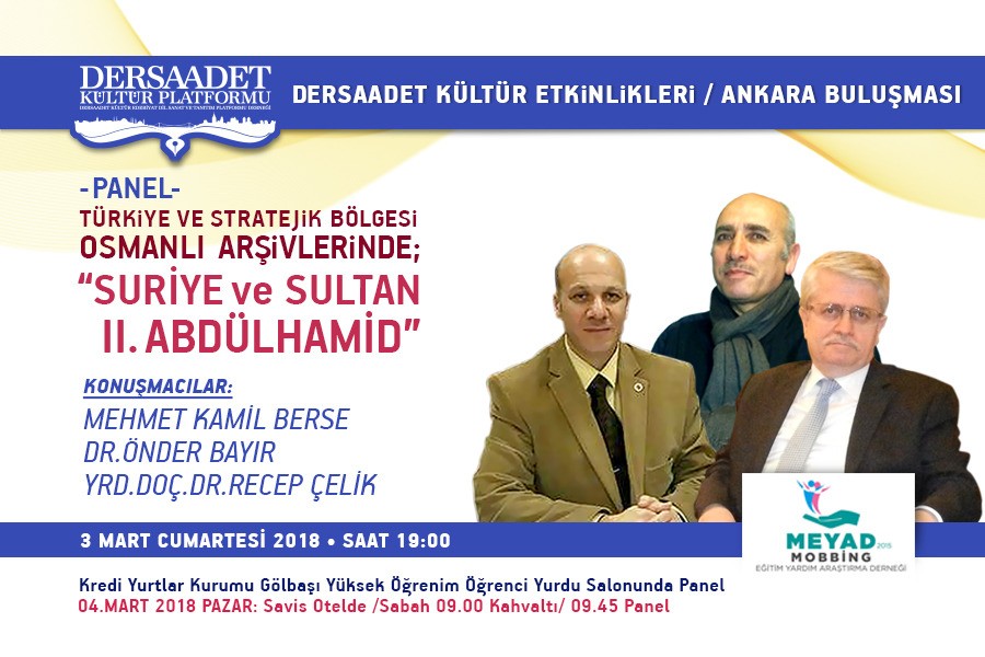 Dersaadet Platformu ve Meyad Mobbing Eğitim Yardım Araştırma Derneği tarafından Ankara'da "Türkiye ve Stratejik Bölgesi Osmanlı Arşivlerinde; Suriye ve Sultan II. Abdülhamid" başlıklı bir panel düzenlenecek.