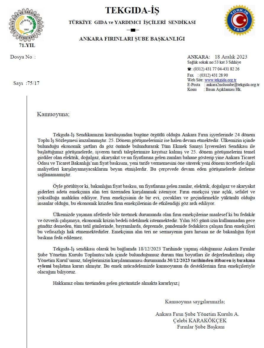 Tekgıda-İş sendikası olarak bu bağlamda 18/12/2023 Tarihinde yapmış olduğumuz Ankara Fırınlar Şube Yönetim Kurulu Toplantısı’nda içinde bulunduğumuz durum tüm boyutları ile değerlendirilmiş olup Yönetim Kurul’umuz, taleplerimizin karşılanmaması durumunda 30/12/2023 tarihinden itibaren iş bırakma eylemi başlatma kararı almıştır. Bu emek mücadelemizde kamuoyunun da desteklerinin fırın emekçileriyle olacağını biliyoruz.
