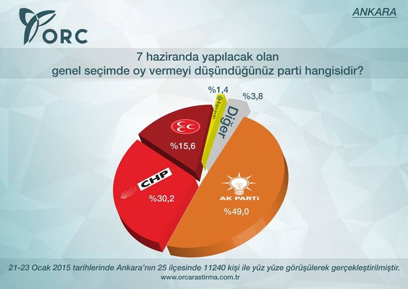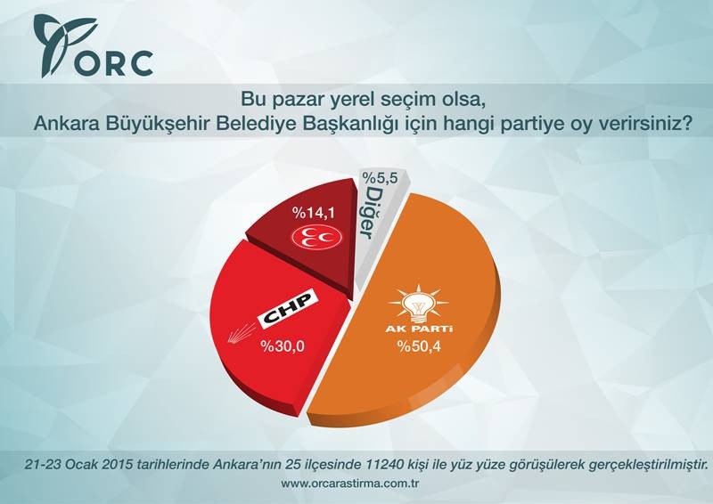 ORC araştırma şirketi 21-23 Ocak 2015 tarihleri arasında Ankara'nın 25 ilçesinde 11 bin 240 kişi ile gerçekleştirdiği ankette vatandaşlara “7 Haziran'da yapılacak olan genel seçimlerde kime oy verirsini?” ve “Bu pazar seçim olsa Ankara Büyükşehir Belediye Başkanlığı için hangi partiye oy verirsiniz” sorusunu yöneltti.