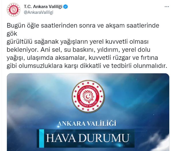 Ankara Valiliği öğle saatlerinden sonra kuvvetli yağış beklendiğini belirterek, “Ani sel, su baskını, yıldırım, yerel dolu yağışı, ulaşımda aksamalar, kuvvetli rüzgar ve fırtına gibi olumsuzluklara karşı dikkatli ve tedbirli olunmalıdır.” uyarısında bulundu.