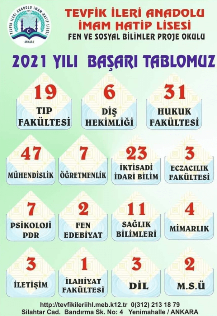 Ankara'da bulunan Tevfik İleri Anadolu İmam Hatip Lisesi Fen ve Sosyal Bilimler Proje Okulu, 2021 YKS'deki başarısı ile büyük gurur yaşattı.